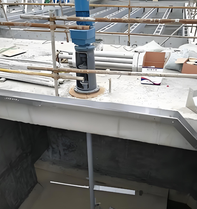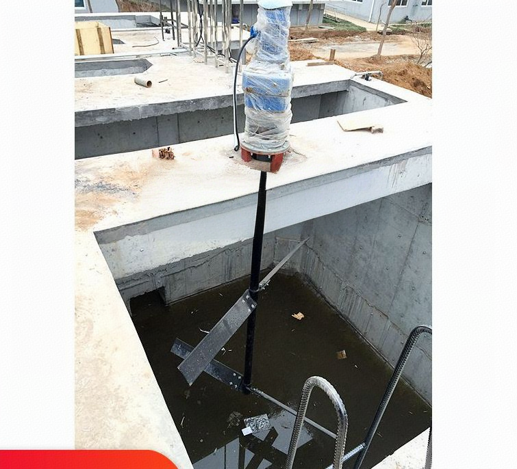 2、通过联轴器联接的搅拌机轴伸向池中,轴上装有搅拌叶片。